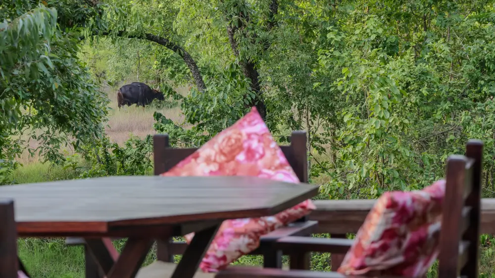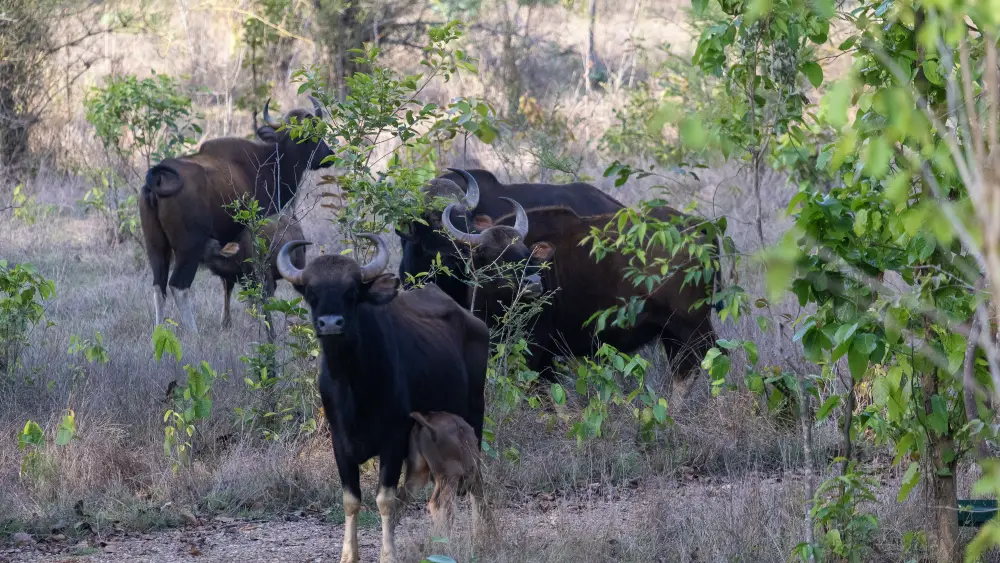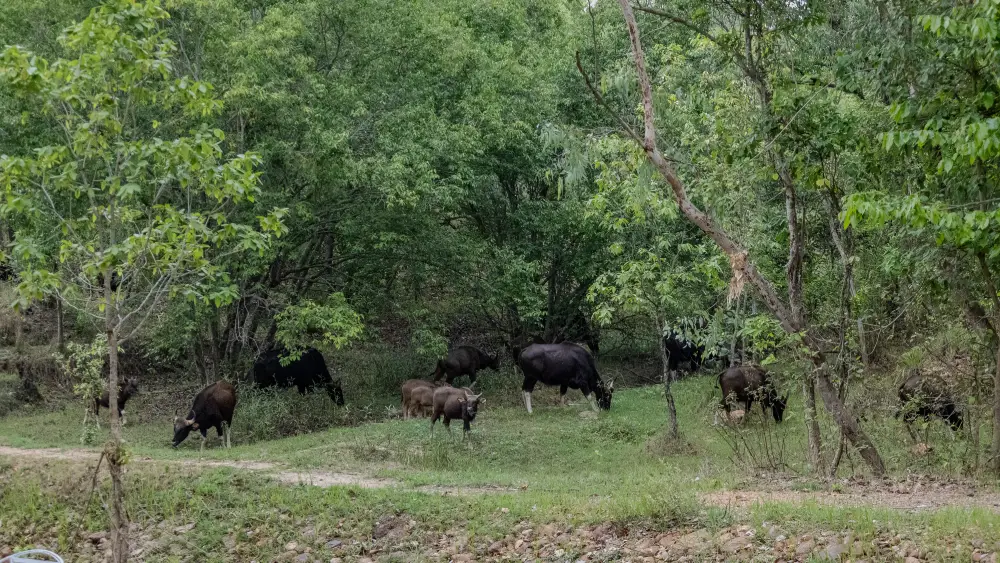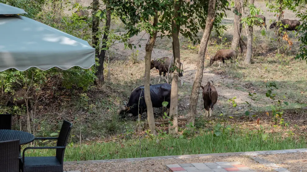 Gaur herds love the grassland situated at the property. You can see them grazing from the veranda or the tent deck. March to July they almost visit daily. Best to keep a safe distance from these giants- they are unpredictable and dangerous.