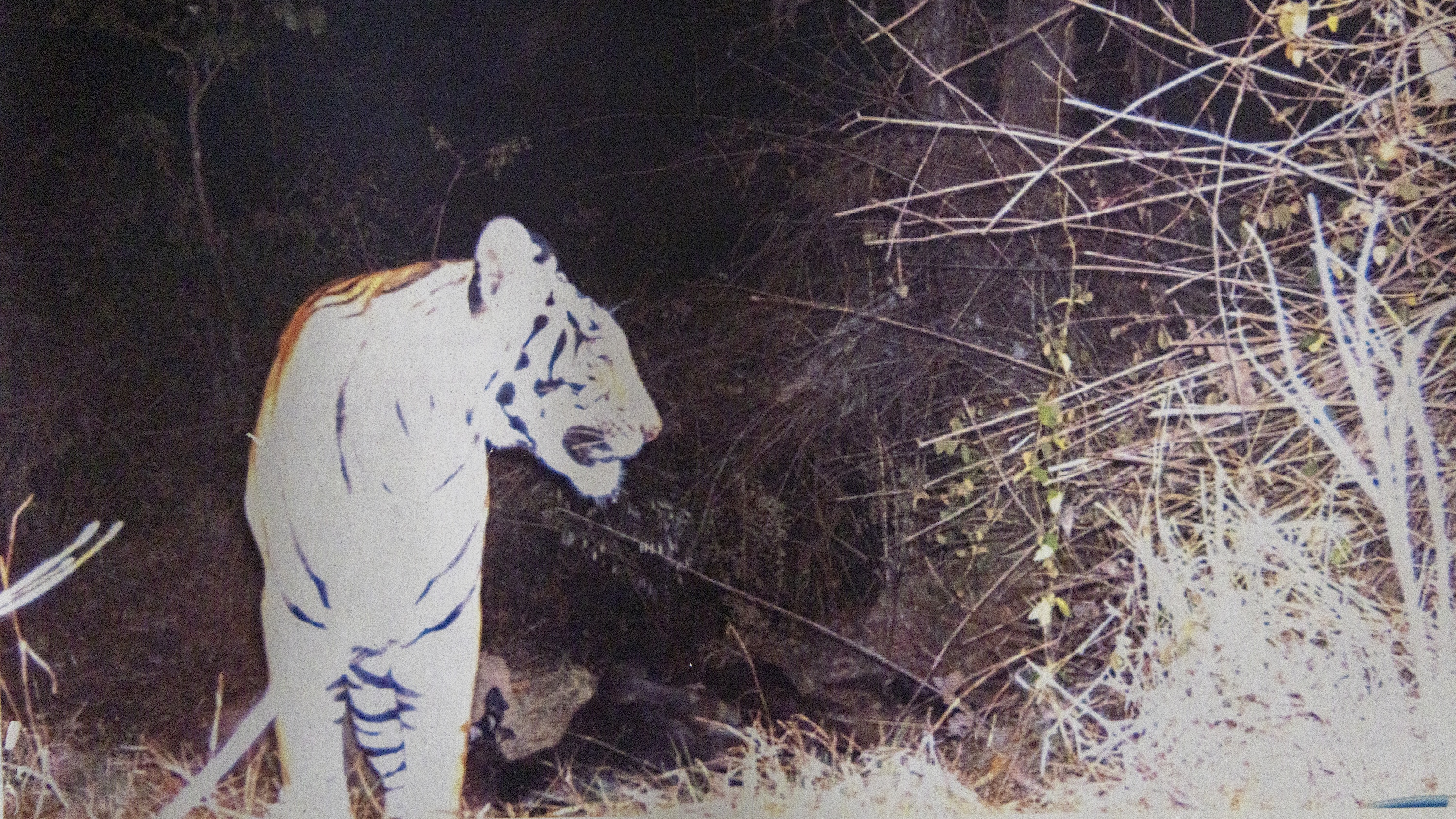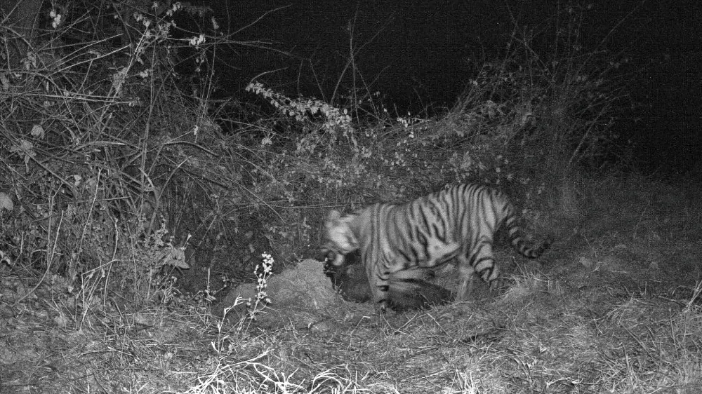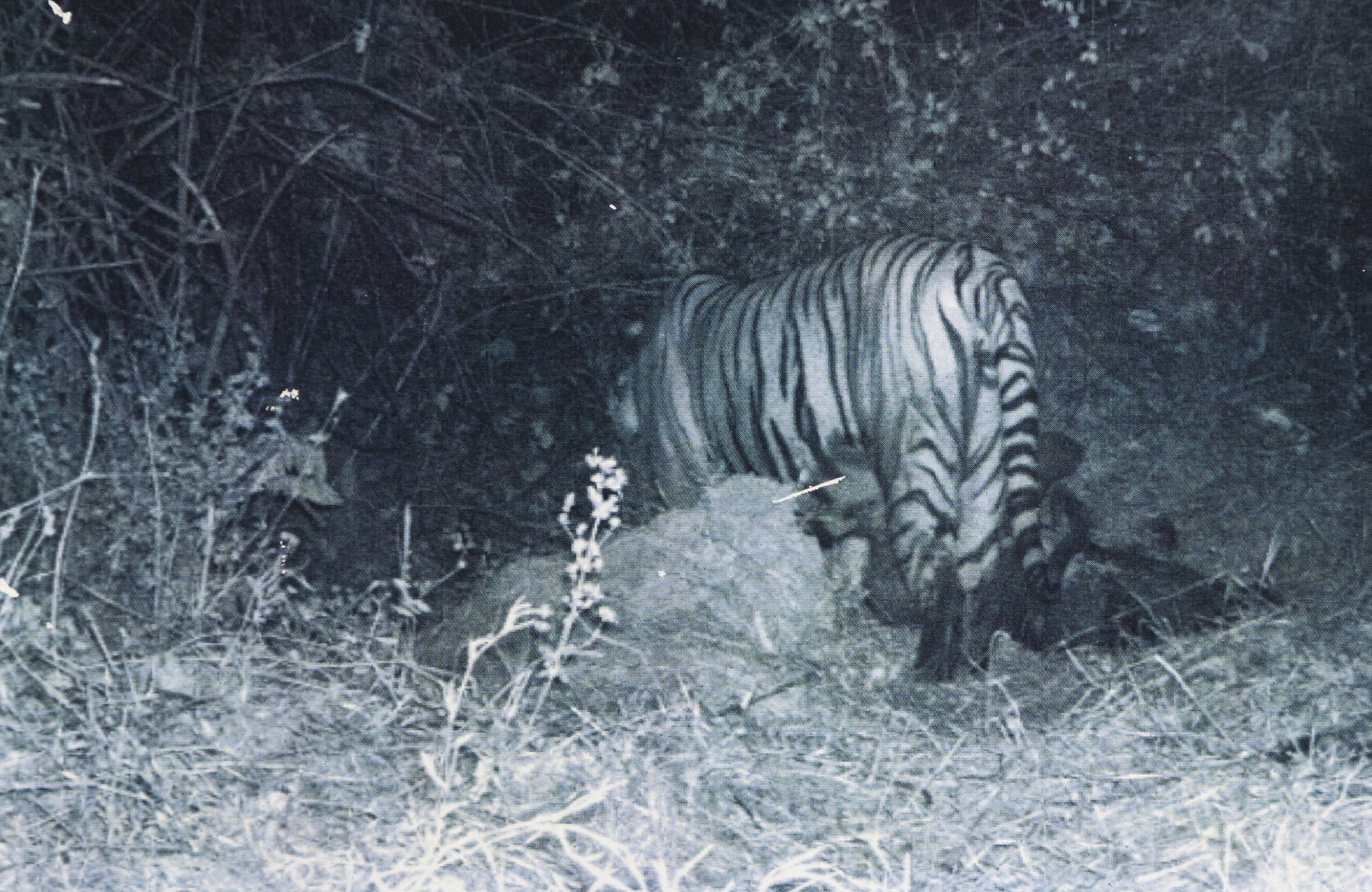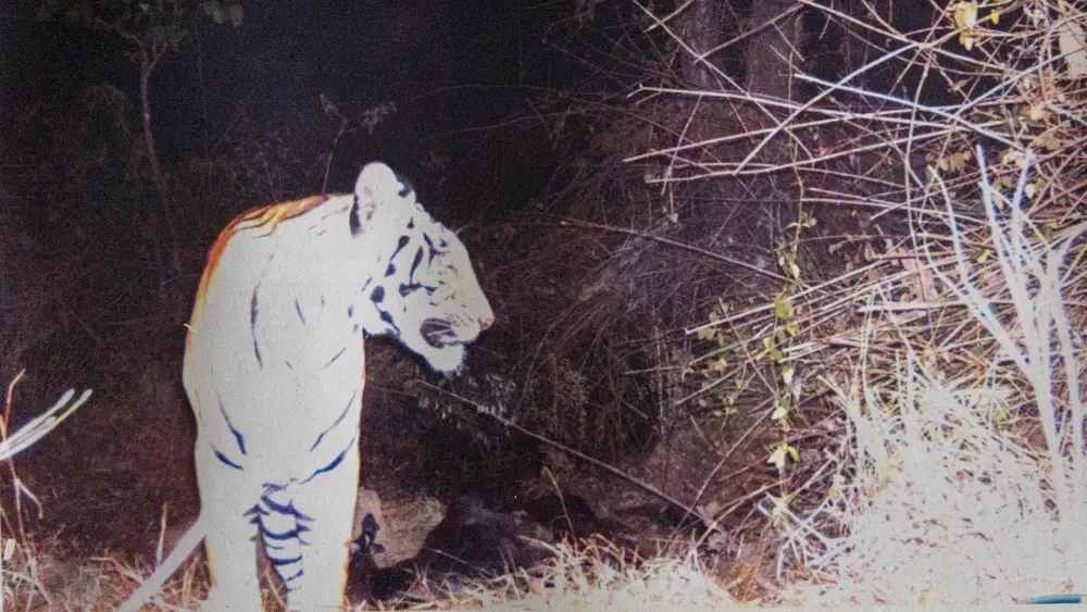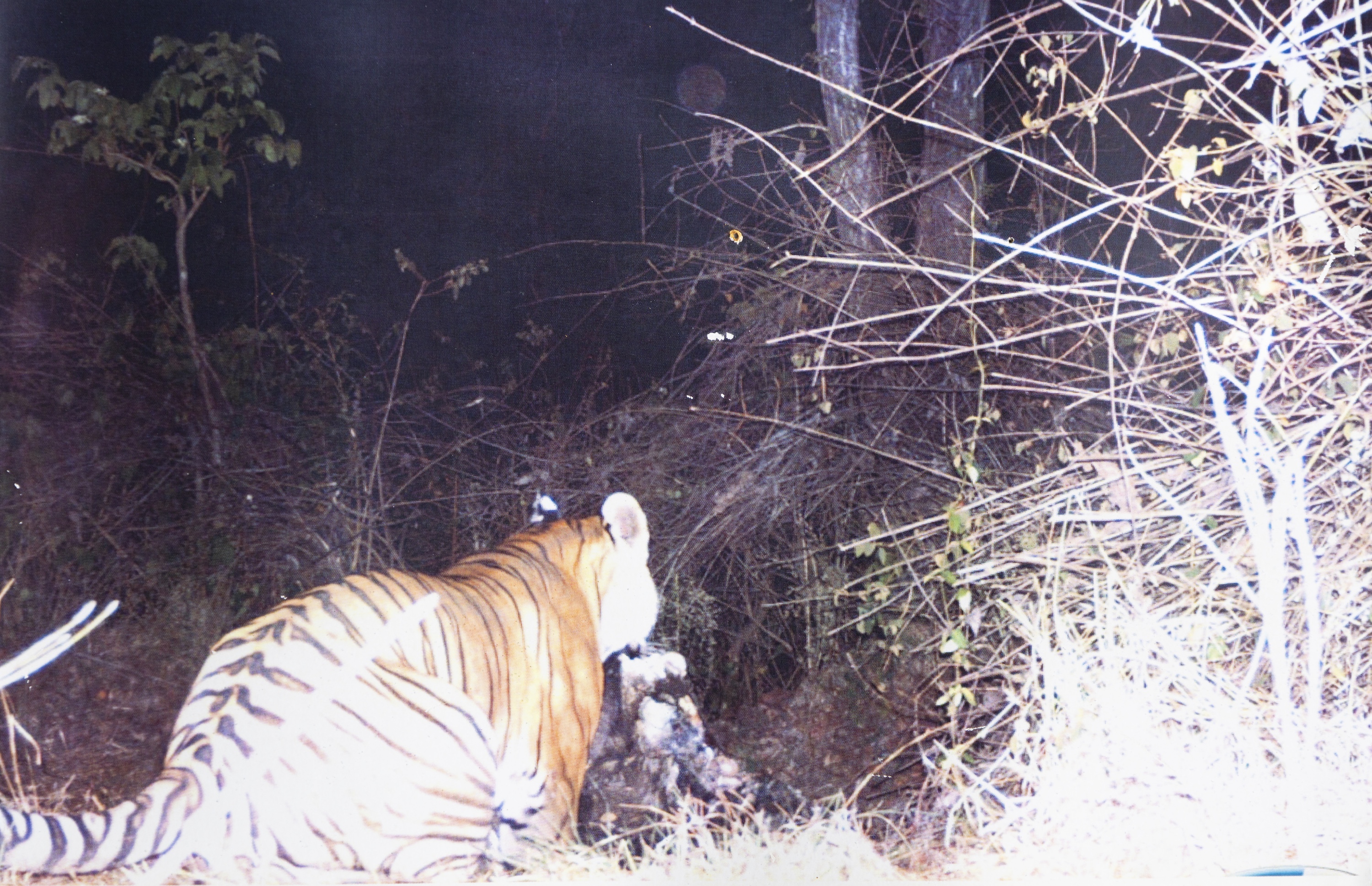 Tigers do visit the property but not as regularly as the Gaur. Choti Mada (T31), the famous Tigress who regaled visitors to Kanha National Park for more than a decade, was, however, a regular visitor. Born in 2008, she spent her childhood with her mother Badi Mada at the property. As she matured she regularly visited the camp, once seen by the staff sitting in the veranda of the Bungalow with her cubs. Some of her photographs taken by trail cameras fixed in front of the Bungalow are thumbnailed. Choti Mada was last seen in 2022. In February 2024 one of her cubs, now mature, was spotted by an esteemed guest while walking on the camp trails. Watch the videos below.